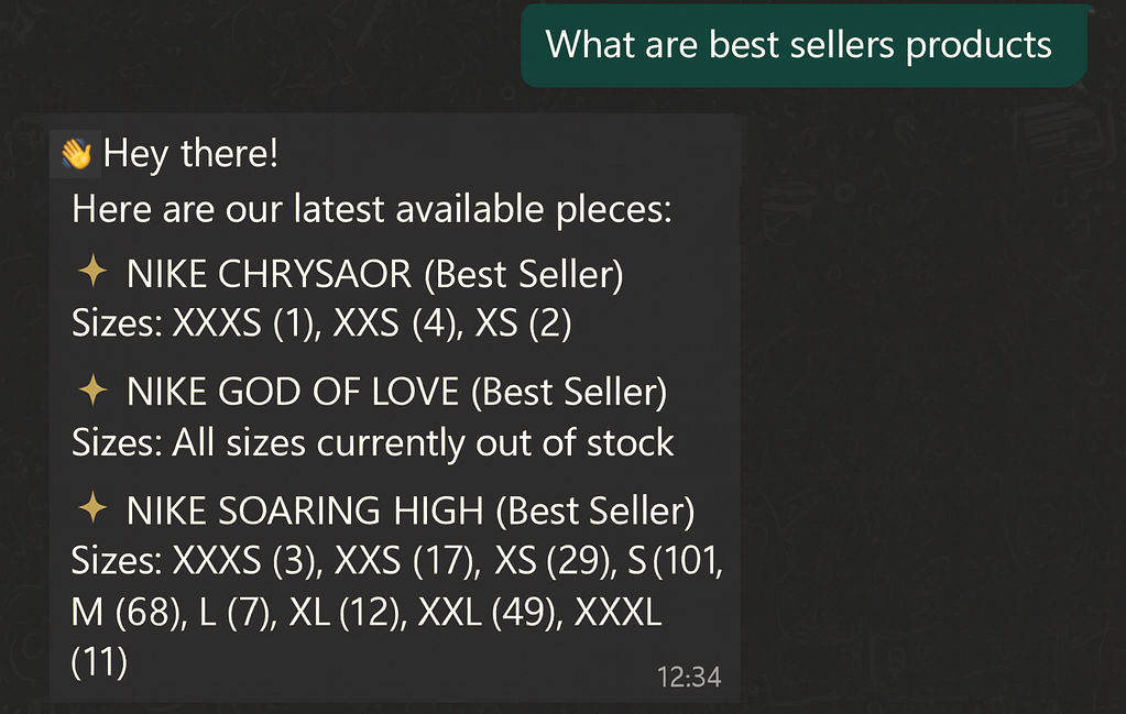 "content": "# 🚀 Try It Out!\n\nThis n8n template demonstrates how to build an **AI-powered WhatsApp & Shopify Support Copilot**. \nIt integrates **WhatsApp Business API**, **Shopify API**, and **LLM Agents** to handle order status queries, product lookups, and customer support escalation.\n\n**Use cases**: Automate order tracking, respond with real-time product availability, or escalate complex issues to a Slack support channel.\n\n---\n\n## How it works\n- **Trigger**: A WhatsApp webhook activates on every new customer message. \n- **Customer Lookup**: Fetches details from Shopify using the customer’s WhatsApp number. \n- **Input Normalization**: Cleans and categorizes user queries. \n- **Intent Switch**: Routes requests to Order Agent, Product Agent, or Support. \n- **Orders Agent**: Retrieves latest Shopify order data, parses, and sends status via WhatsApp. \n- **Products Agent**: Pulls inventory & best sellers from Shopify and replies with sizes/availability. \n- **Support Escalation**: Posts unresolved queries to Slack for human intervention.\n\n---\n\n## How to use\n- Configure **WhatsApp Business API**, **Shopify Admin API**, and **Slack OAuth** credentials in n8n. \n- Sync products via Shopify API. \n- Test with queries like “Where is my order?” or “Show me best sellers.” \n- Escalate unresolved issues directly to Slack with context.\n\n---\n\n## Requirements\n- WhatsApp Business API (Meta, Twilio, or Exotel) \n- Shopify Admin API access \n- LLM provider key (OpenAI / OpenRouter) \n- Slack OAuth or webhook for human support \n\n---\n\n💡 Always open to feedback and improvements! **DM me at [info@zenithworks.ai](mailto:info@zenithworks.ai).**\n"