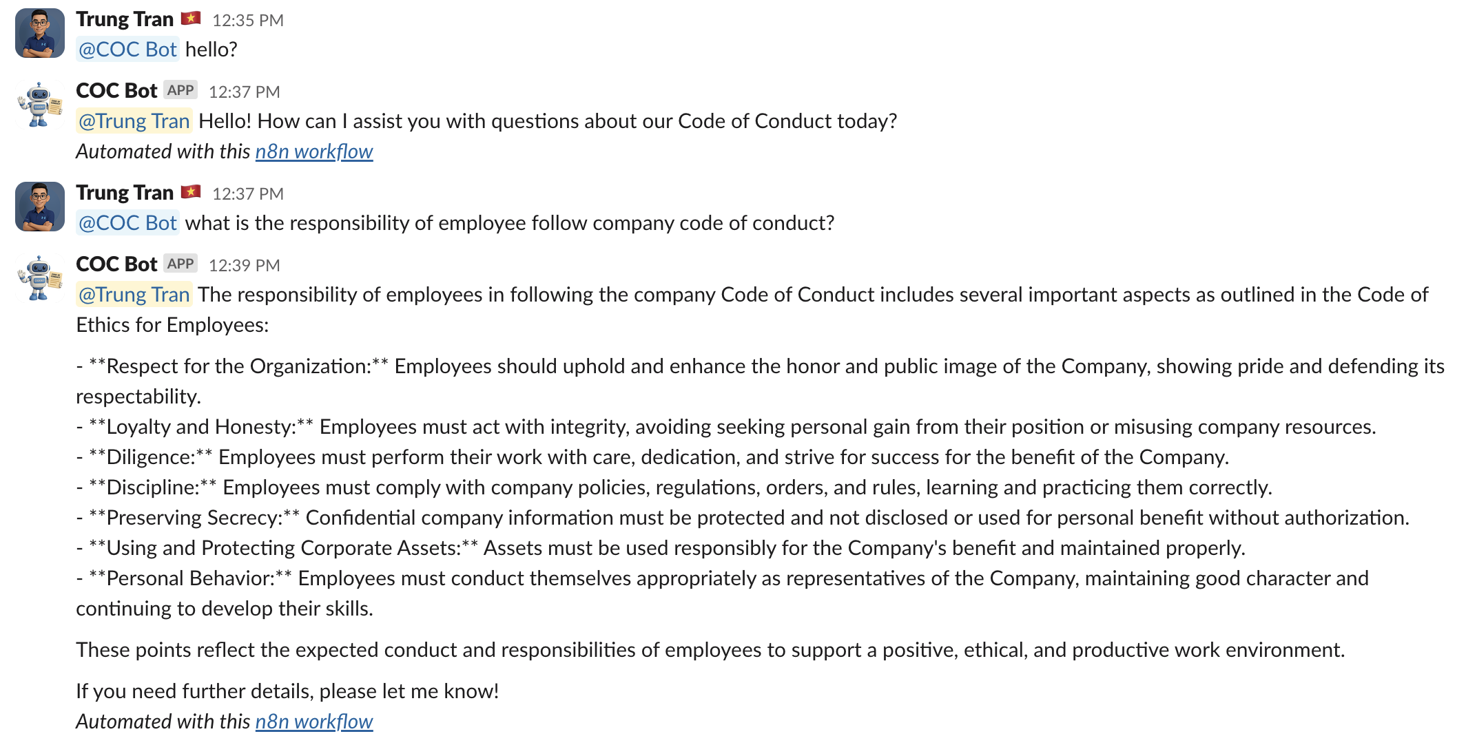 "text": "=<@{{ $json.id }}> {{ $('Code Of Conduct Agent').item.json.output }}",