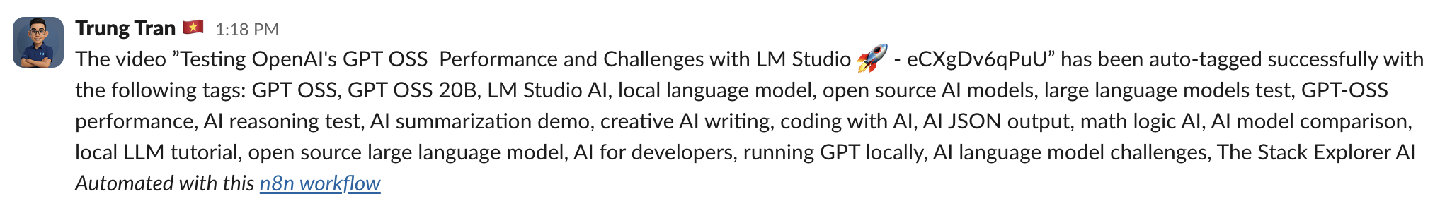 "text": "=The video ”{{ $json.snippet.title }} - {{ $json.id }}” has been auto-tagged successfully with the following tags: {{ $('Youtube Video Auto Tagging Agent').item.json.output }}",
